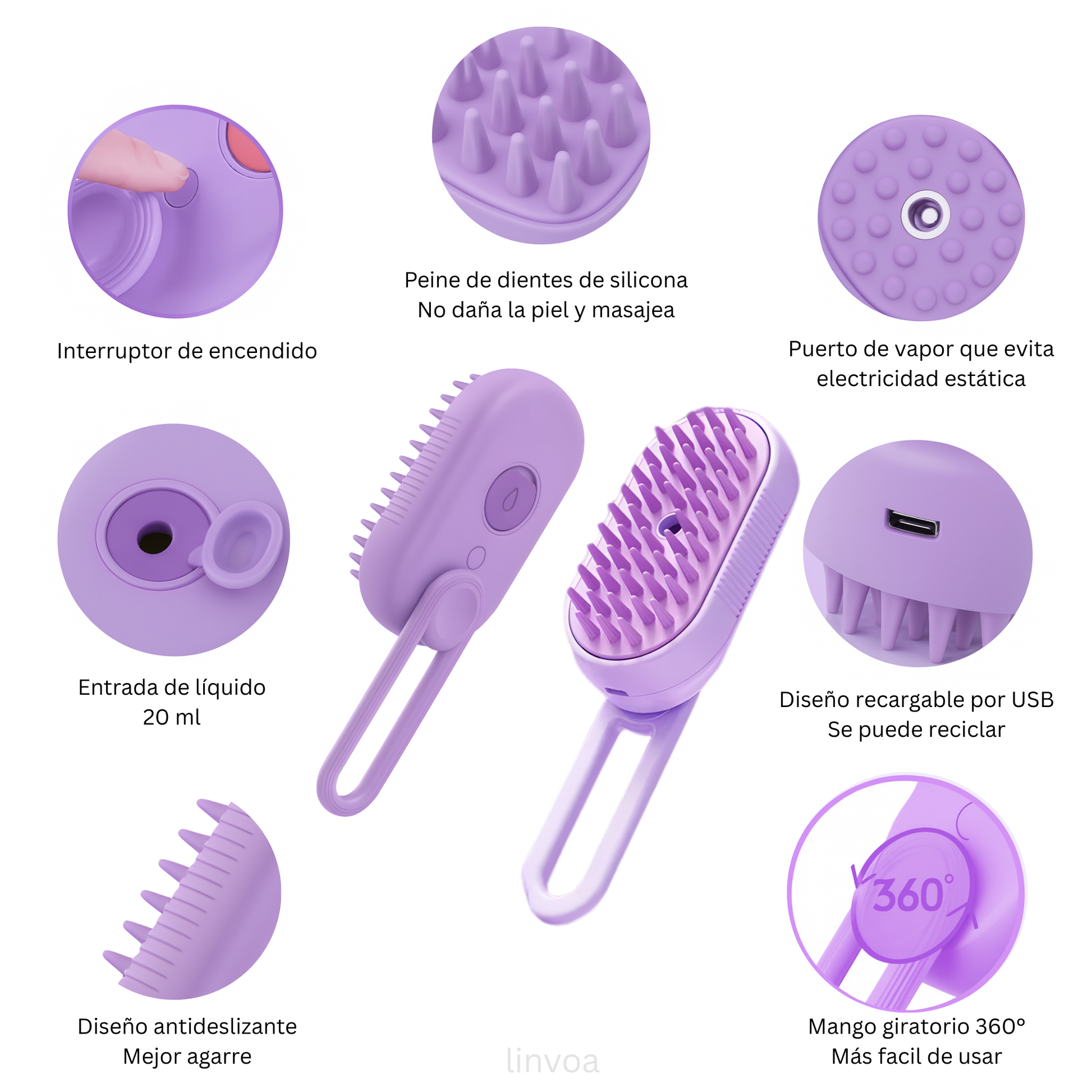 El innovador cepillo a vapor combina tres funciones esenciales: desenredo, limpieza profunda y masaje relajante. La tecnología de vapor ayuda a aflojar el pelo muerto y facilita su eliminación sin tirones.